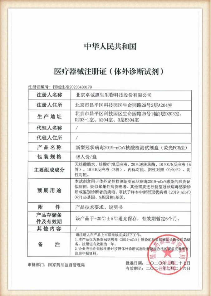好消息!北京卓誠(chéng)惠生新型冠狀病毒核酸檢測(cè)試劑獲得醫(yī)療器械注冊(cè)證!