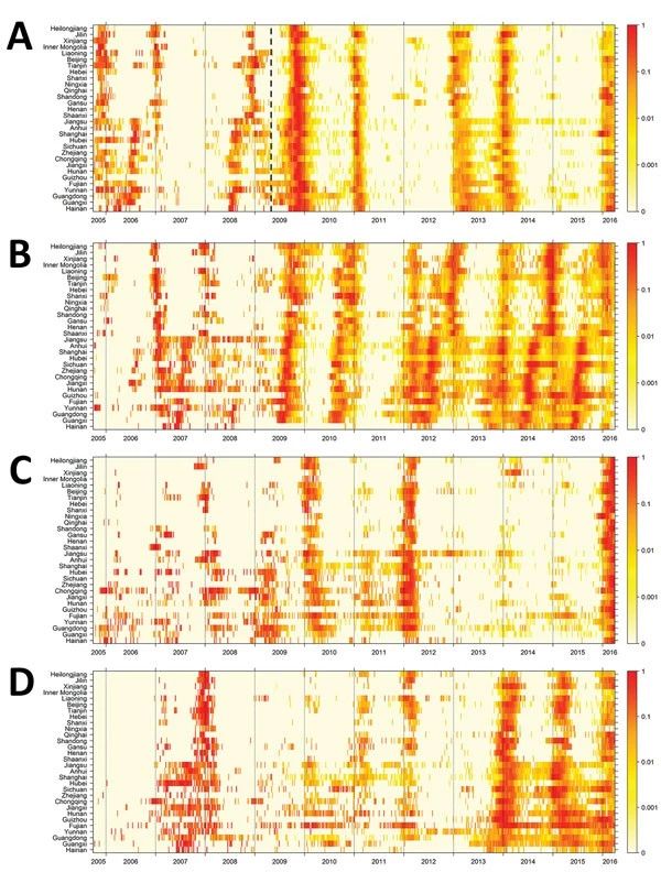 Fig. 1 Heatmap of influenza virus activity by lineage in 30 provinces and municipalities (sorted by latitude), China, October 2005–March 2016. A) Influenza A(H1N1); B) influenza A(H3N2); C) influenza B Victoria lineage; D) influenza B Yamagata lineage.