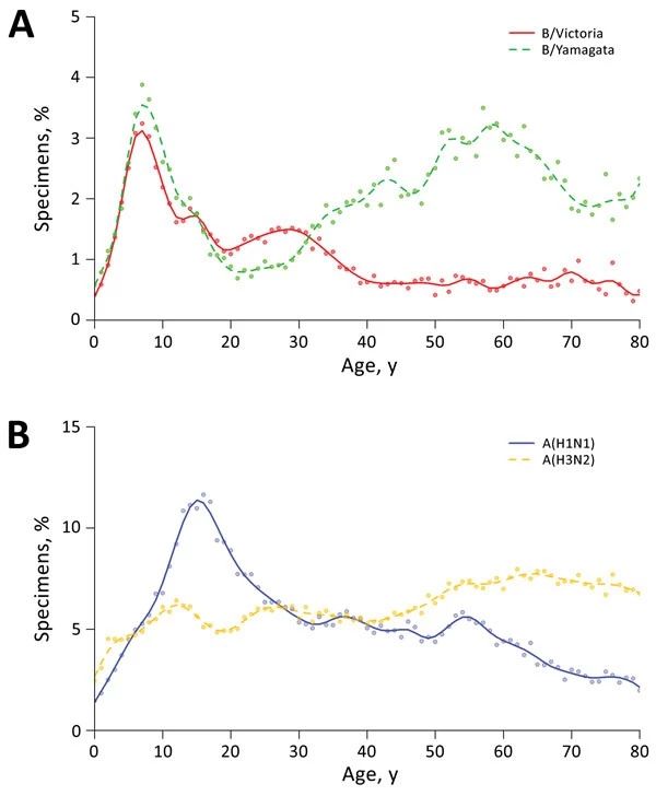 Fig. 2 Age-specific proportions of sentinel specimens collected from sentinel surveillance sites testing positive for influenza, China, October 2005–March 2016. A) Influenza B/Victoria and B/Yamagata lineages; B) influenza A(H1N1) and A(H3N2).?
