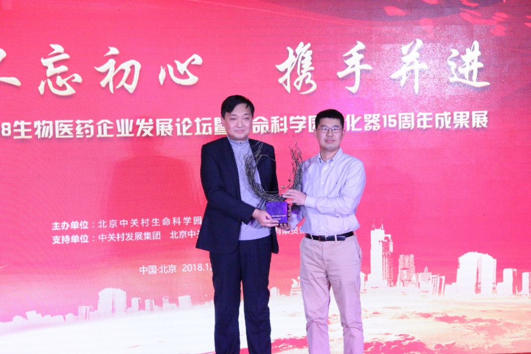 在本次論壇上,北京卓誠惠生生物科技股份有限公司副總經(jīng)理王雷代表公司向中關(guān)村生命園孵化器贈送15周年紀(jì)念品——鳳巢雕塑,祝愿孵化器將來有更多“金鳳凰”從這里騰飛。