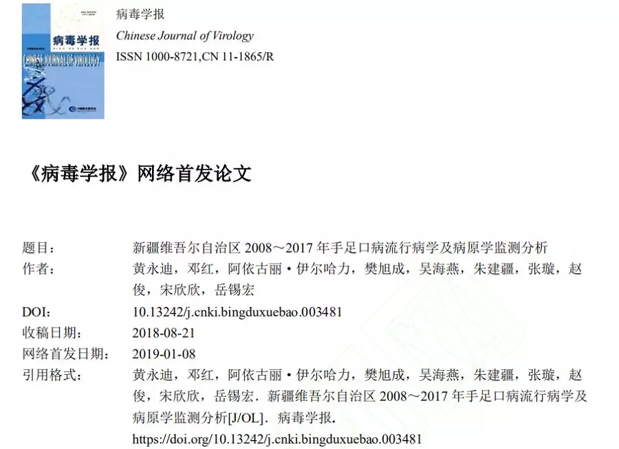 【文獻速覽】新疆維吾爾自治區(qū)2008年~2017年手足口病流行病學及病原學監(jiān)測分析
