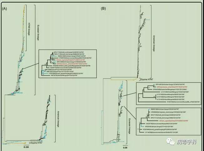圖2 ?兩株野鳥(niǎo)源H7N7毒株HA和NA片段的最大似然法進(jìn)化樹(shù)