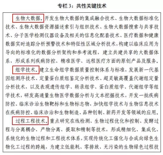 具體涉及的技術(shù)包括:1)新一代生物檢測(cè)技術(shù)、2)新一代基因操作技術(shù)、3)合成生物技術(shù)、4)腦科學(xué)和類腦人工智能、5)微生物組技術(shù)、6)納米生物技術(shù)、7)生物影像技術(shù)、8)生物大數(shù)據(jù)、9)組學(xué)技術(shù)以及10)過(guò)程工程技術(shù)(下圖為詳細(xì)介紹)。