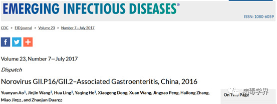 2.Ao Y, Wang J, Ling H, He Y, Dong X, Wang X, PengJ, Zhang H, Jin M, Duan Z. Norovirus GII.P16/GII.2-Associated Gastroenteritis, China, 2016. Emerg Infect Dis. 2017 Jul; 23(7):1172-1175.